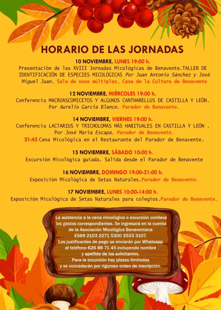 El programa arranca el lunes 10 de noviembre, a las 19:00 h, con la presentación oficial y un taller de identificación de especies micológicas, a cargo de Juan Antonio Sánchez y José Miguel Juan, que se celebrará en la Casa de la Cultura de Benavente.